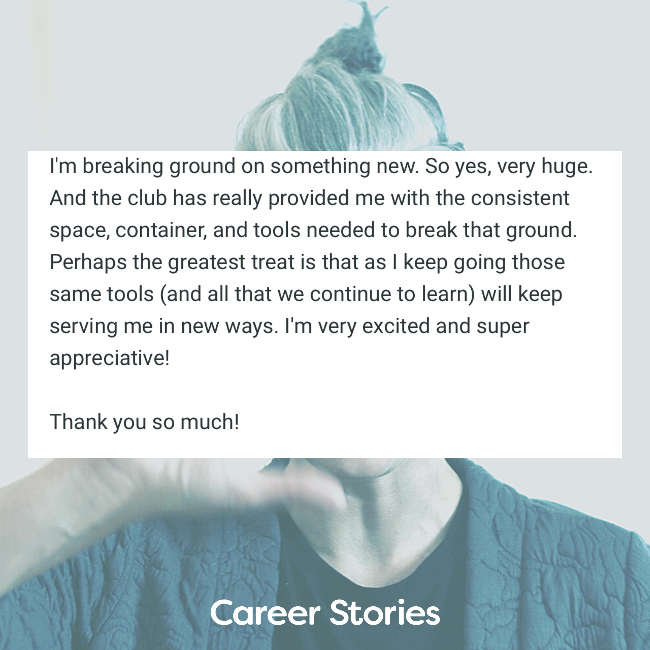 As a member of Career Stories 2.0, you’ll get access to live challenges, pop-up experiences, and micro-trainings for the year. Similar to The Experiment, these get your story primed and embodied. You’ll do seven challenges this year.
